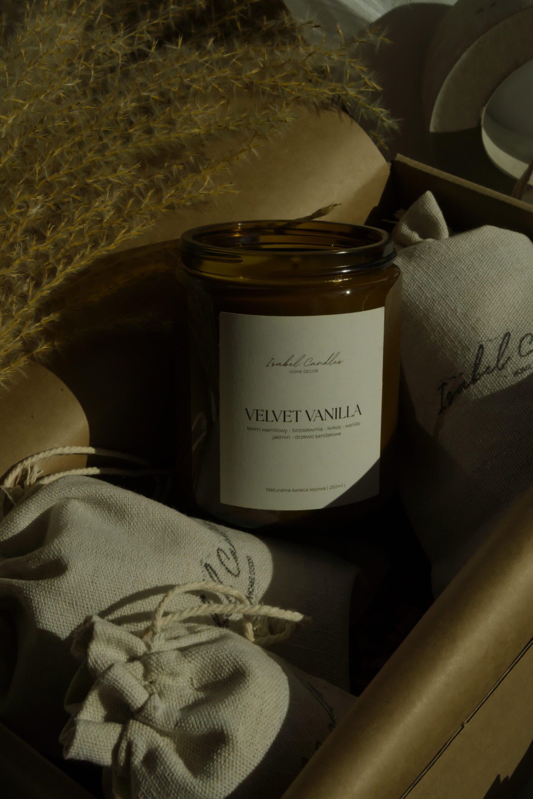 Velvet Vanilla (wanilia) to zapach, który otula ciepłem i słodyczą – jak połączenie kremowego budyniu z delikatnymi lodami waniliowymi. Soczysta brzoskwinia wprowadza owocową świeżość, a delikatny kokos dodaje miękkiej, kremowej nuty. Całość spoczywa na aksamitnej waniliowej bazie, pełnej przytulnego ciepła i zmysłowej słodyczy. Idealny wybór na zimowy czas – uspokaja, otula i wprowadza w błogi nastrój.